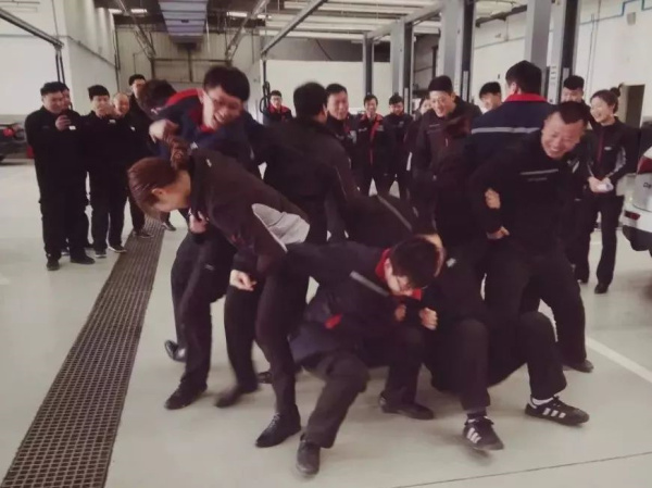 3月16日上午8點(diǎn)30分,在東新奧迪的售后車間便舉辦了這樣一場(chǎng)形式新穎地互動(dòng)型晨會(huì)。當(dāng)同事們得知今天的晨會(huì)還有做游戲,一個(gè)個(gè)臉上都露出了期待的表情。隨著服務(wù)總監(jiān)一聲令下,所有人迅速分成了四組,每組首先選取四個(gè)人背靠背坐在地上,四人相互挽著胳膊,當(dāng)聽到起立口令的時(shí)候,用腿以及后背的力量站起來,以后每組依次增加2人。當(dāng)每組達(dá)到10個(gè)人的時(shí)候,想要全部站起來非常不容易。